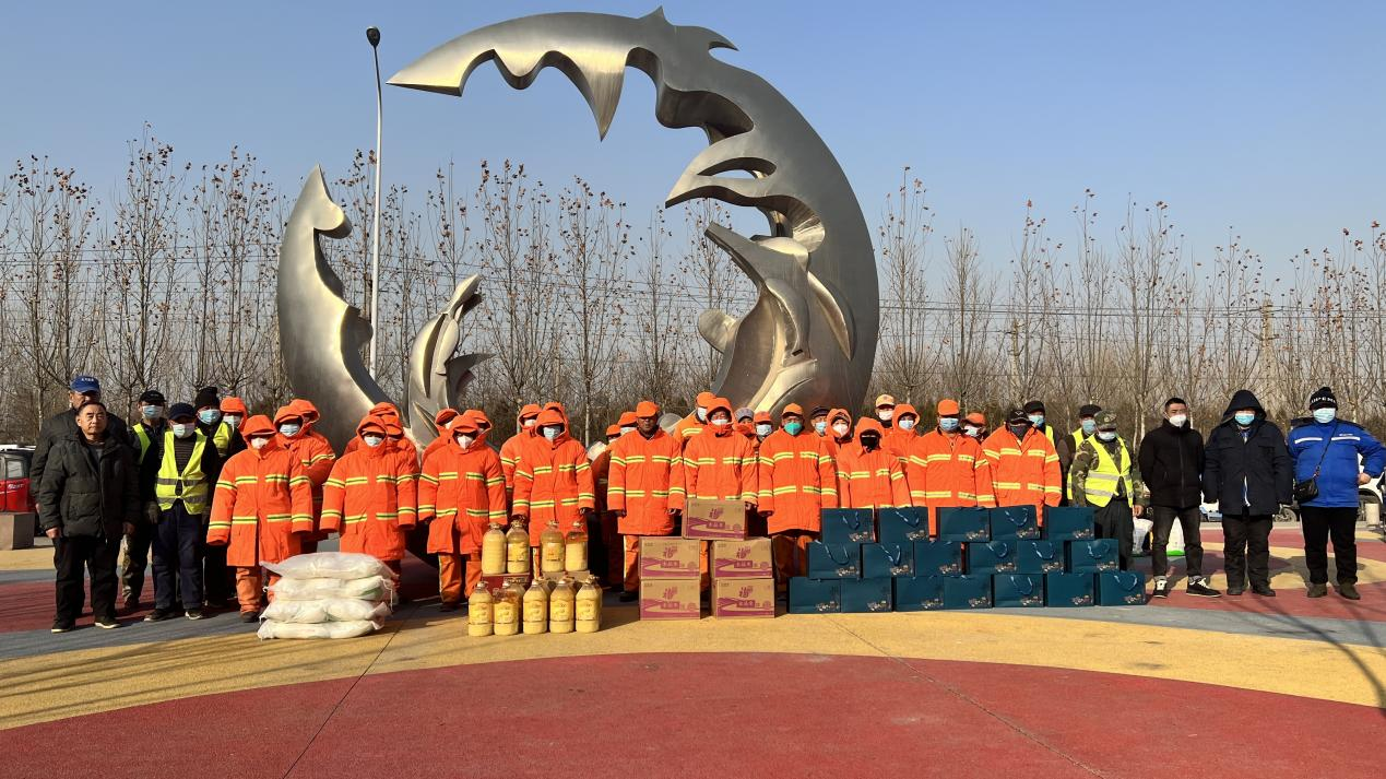 圖為小清河項(xiàng)目經(jīng)理劉淑國(guó)為一線(xiàn)工人準(zhǔn)備新年福利。工人們紛紛趕來(lái)領(lǐng)取禮品。